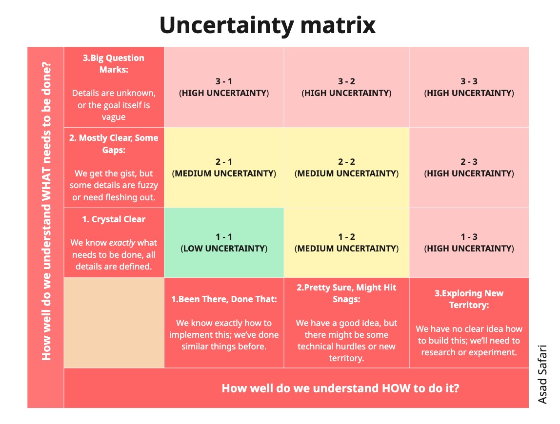 اول از همه، همه آیتمهای بکلاگ از نظر میزان ابهام یکسان نیستند. بعضی از آنها خیلی سرراست هستند، برخی دیگر کاملاً مبهم و ناشناخته هستند. ماتریس ابهام یک ابزار فوقالعاده سادهست که کمک میکند این موضوع را درست تشخیص بدهید.